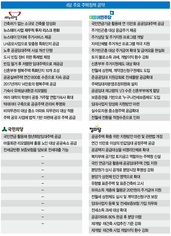 실제로 20대 총선에 출사표를 던진 주요 정당은 주거 관련 공약을 쏟아냈다. 여야가 공통적으로 내건 주거안정 대책은 ‘공공임대주택 공급’이다. 현재 전체 주택 시장의 5% 정도에 불과한 임대주택을 경제개발협력기구(OECD) 평균치인 11% 이상으로 늘려 주거안정을 꾀하겠다는 거다.