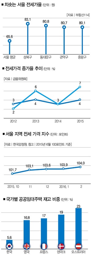 “43개월 연속 상승.” 치솟는 우리나라 전세 가격의 현실이다. 19대 총선이 끝난 2012년 9월 이후 내리막길을 걸은 적이 없다. 내 집 마련이 쉬운 것도 아니다. 지난해 서울 아파트의 평균 매매가는 5억5130만원. 우리나라 국민의 월 평균 가처분소득이 356만원이라는 걸 감안하면 숨만 쉬고 13년을 모아야 아파트 한 채를 구입할 수 있다는 얘기다.