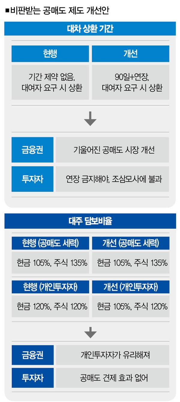 더불어 외국인 투자자의 경우 대차 거래가 해외에서 이뤄지기 때문에 국내법으로 정한 담보비율을 적용하기 어렵다는 점도 개인투자자의 담보비율을 낮춘 요인으로 작용했다. 얼핏 보면 ‘기울어진 운동장’을 바로잡는 방안 같다. 하지만 시장에선 이를 두고 투자자의 불만을 달래려는 ‘눈 가리고 아웅’식 대안에 불과하다고 비판한다.