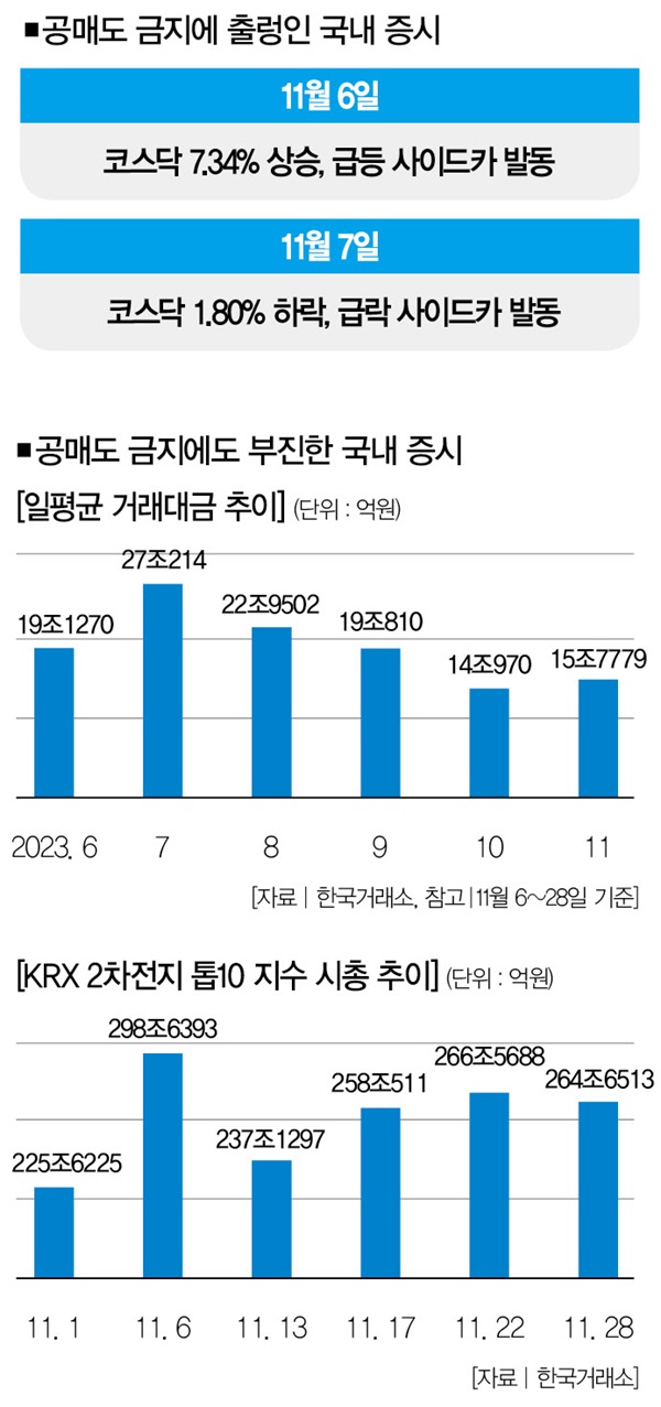 ‘2008년 글로벌 금융위기, 2020년 코로나19 팬데믹과 같은 외부 충격이 아닌 불법공매도라는 내부 요인으로 공매도를 금지했다’ ‘외국인 자금 이탈 등의 부작용을 일으킬 수 있다’는 게 반론의 이유였다. 엇갈린 전망을 반영하듯 다음날 코스닥시장에선 지수 급락으로 인한 사이드카가 발동했다.