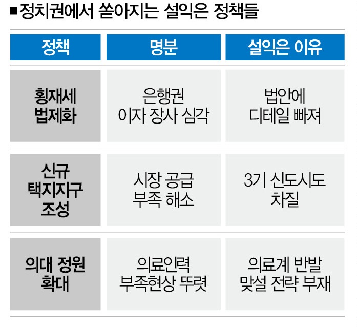 그뿐만이 아니라 초과이익의 산정방법, 횡재세 납부방법과 절차, 미납 시 조치사항 등 디테일한 항목도 법안에 넣지 않았다. 이 때문에 민주당의 은행 횡재세는 여당에 ‘표심’을 빼앗기지 않기 위해 허겁지겁 만든 ‘허울뿐인 법안’이란 비판에 직면해 있다. 포퓰리즘의 부메랑을 맞은 셈이다.