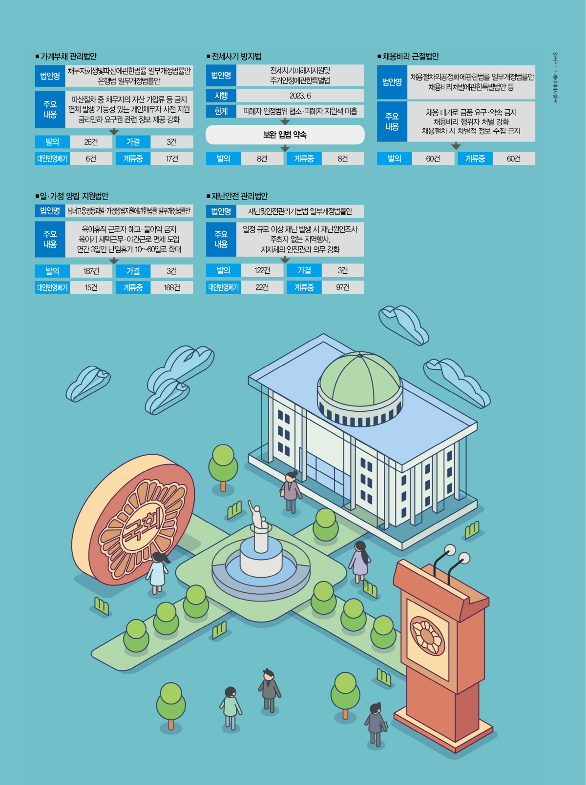 ■ 민생법안➋ 전세사기 = 지난해 초 ‘전세사기’가 청년층과 서민층을 할퀴었다. 전 재산에 대출까지 끼고 지불한 보증금을 돌려받지 못할 위기에 처하자 몇몇 피해자는 스스로 목숨을 끊었다. 그제야 국회가 움직였다. ‘전세사기특별법(전세사기피해자지원및주거안정에관한특별법)’은 지난해 5월 국회 문턱을 넘어 6월 1일부터 시행됐다.