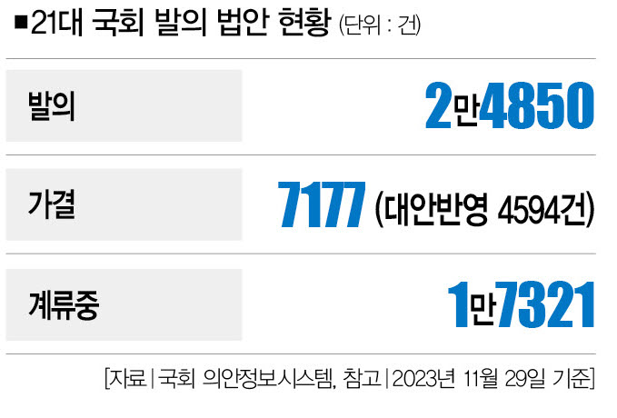 하지만 이중 가결된 건 단 3건(대안반영폐기 15건·철회 1건)에 불과하다. 168건에 달하는 개정안이 헛세월을 보내고 있다.