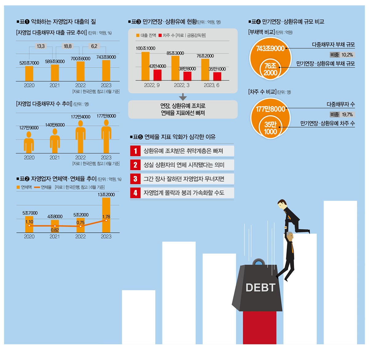 빚더미에 올라앉는 자영업자가 가파르게 늘고 있다. 돈을 빌리는 자영업자도, 대출금을 제때 갚지 못하는 자영업자도 주변에 숱하다. 이를 입증하듯 자영업자 대출 통계는 악화일로를 걷고 있다.