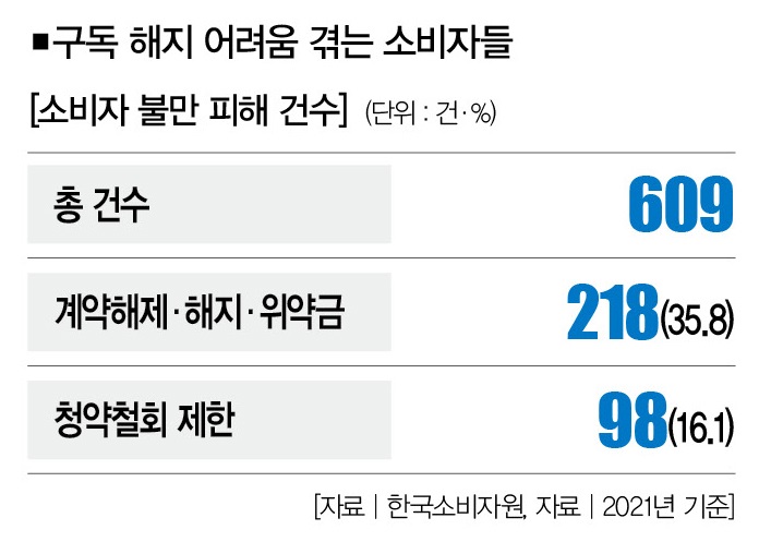 여기에 문제를 삼는 소비자도 적지 않습니다. ‘1372소비자상담센터’에 접수된 소비자 불만·피해 상담은 총 609건이었는데, 그중 ‘계약해제·해지·위약금’이 35.8%(218건)로 가장 많았습니다. 앞서 언급한 ‘청약철회 제한’은 16.1%(98건)에 달했습니다. 그만큼 소비자들이 구독 중단에 애를 먹고 있다는 얘기입니다.