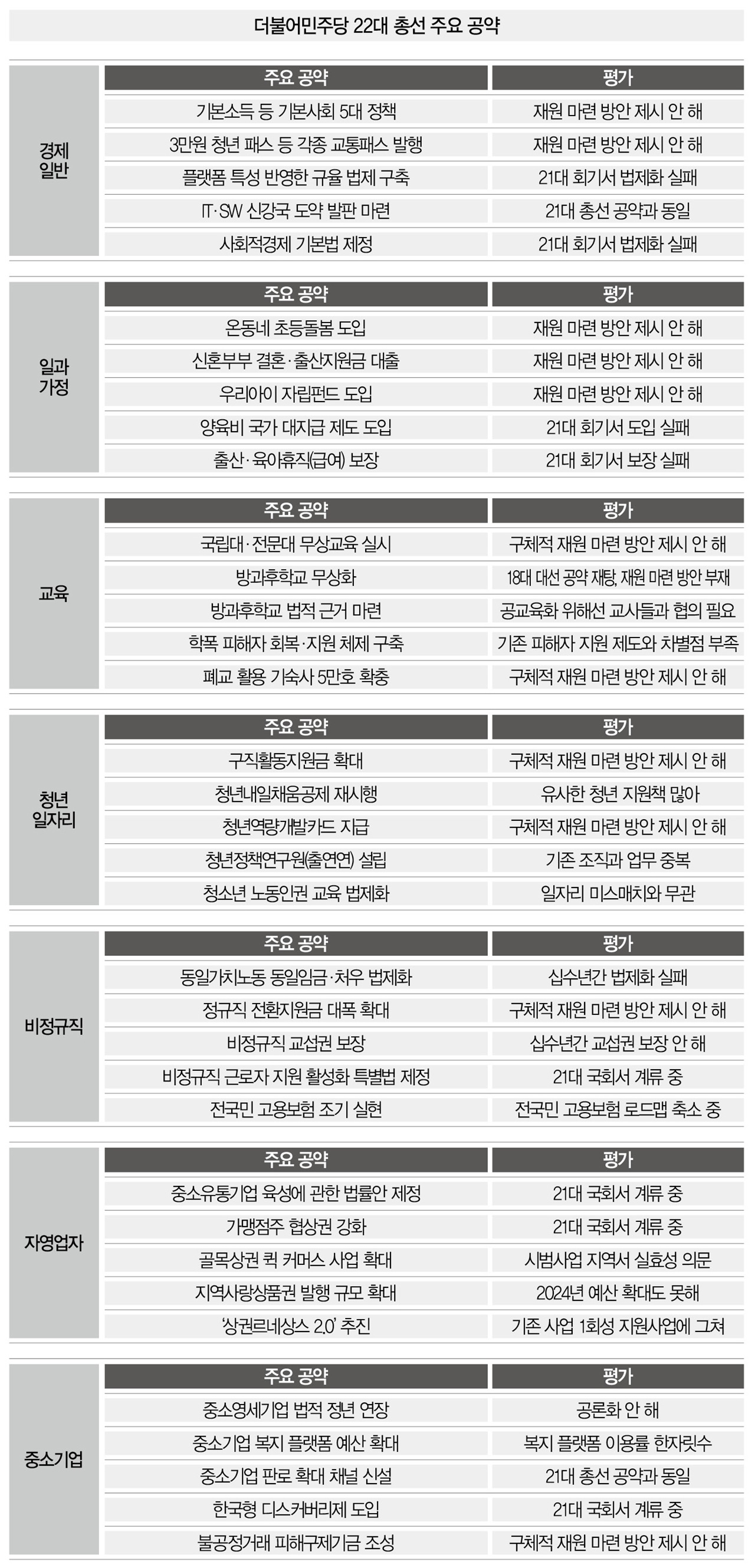 유권자도 마찬가지다. 더스쿠프의 ‘2008년 후 지키지 않은 약속’에서 드러나듯, 실현 불가능한 공약을 남발하거나 공약을 지키지 않았음에도 이들을 투표로 심판하지 않았다. 이는 ‘당선만 되면 그만’이란 정치권의 인식을 부추기고, ‘아니면 말고 식의 공약空約을 쏟아내는’ 악순환의 고리로 이어졌다. 더불어민주당의 4ㆍ10 총선 공약집에도 이런 게 많다. 분야별로 하나씩 뜯어보자.