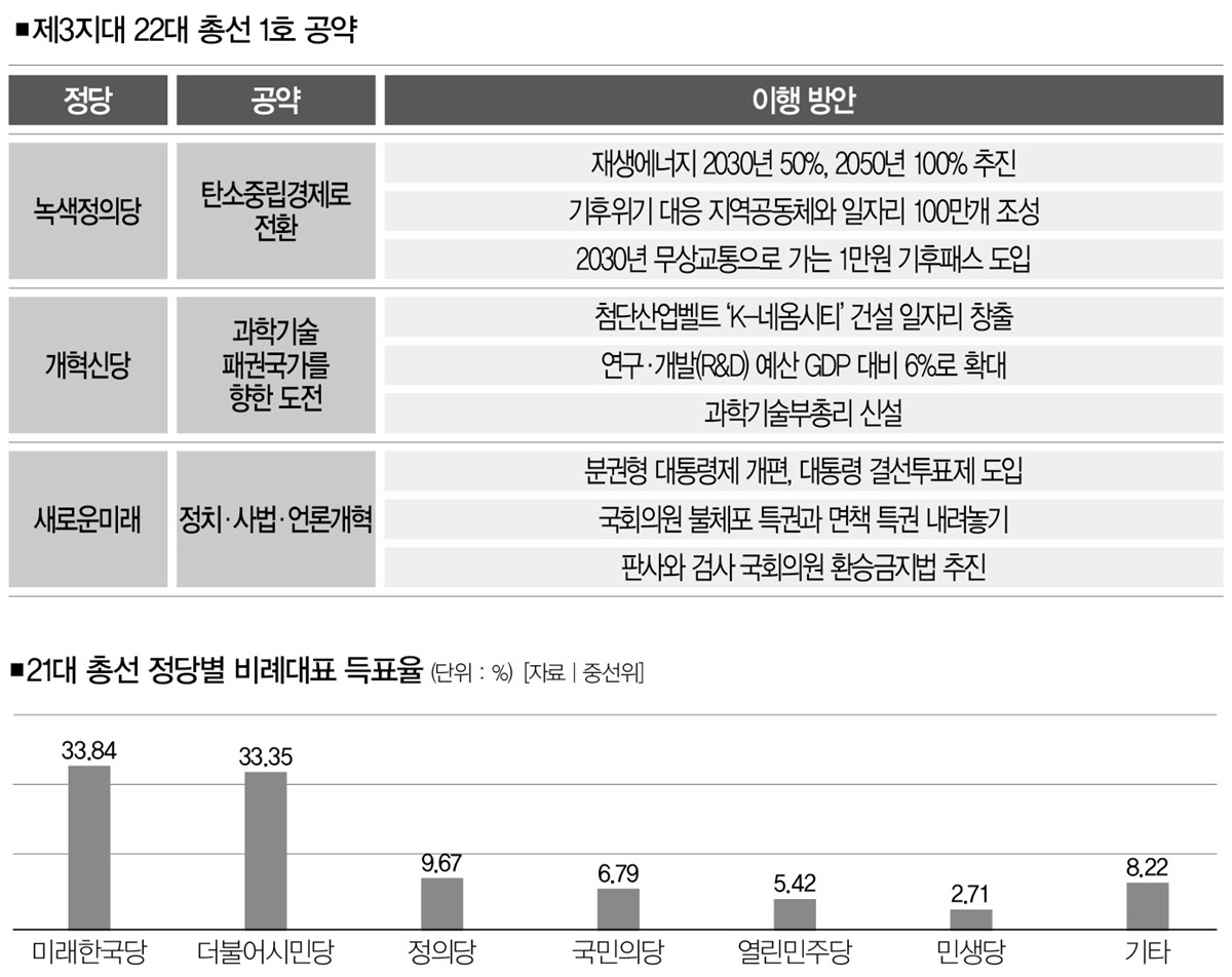 ■ 의문부호들 = 1번 공약이든 후순위 공약이든 중요한 건 달성 가능성이다. 제3지대 정당은 어떨까. 기대보단 우려가 더 많다. 녹색정의당은 탄소중립경제로의 전환이라는 거대 담론을 22대 국회의원 임기 이내에 달성하겠다고 밝혔다.
