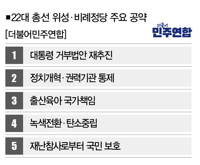 더불어민주연합은 1번 공약으로 대통령 거부권에 막힌 법안의 재추진을 내걸었다. 양곡관리법ㆍ간호법ㆍ노란봉투법ㆍ방송 3법ㆍ이태원 참사 특별법ㆍ김건희 특검법ㆍ대장동 50억 클럽 특검법은 21대 국회에서 본회의를 통과했지만 대통령 거부권으로 시행하지 못했다. 이런 법안들을 재추진하겠다는 거다.