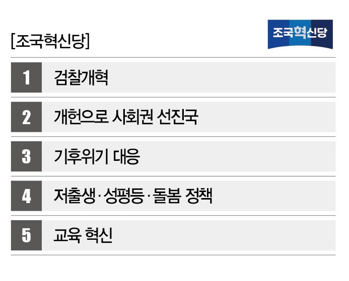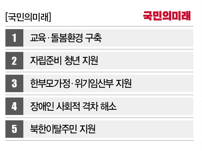 국민의미래는 지원이 필요한 계층을 세분화하는 데 초점을 맞췄다. 2~5번 공약으로 자립준비 청년 지원, 한부모 가정 지원, 장애인 사회적 격차 해소, 북한이탈주민 지원을 나란히 배치했다. 조국혁신당의 2~5번 공약은 개헌, 기후위기 대응, 저출생 대책, 교육혁신이다.