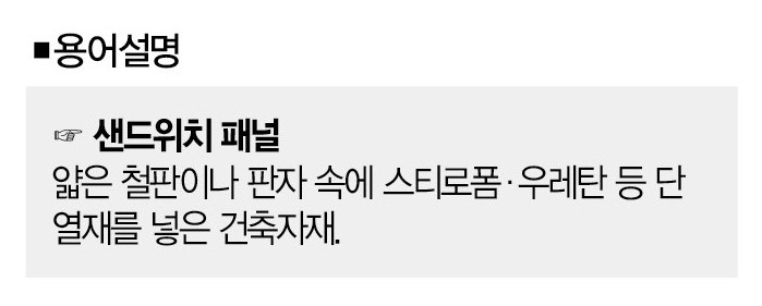 2020년 38명의 목숨을 앗아간 이천 물류창고 화재, 2022년 소방대원 3명이 목숨을 잃은 평택 물류창고 화재도 샌드위치 패널로 만든 건물에서 터졌다. 샌드위치 패널이 그만큼 위험한 소재란 방증이다.