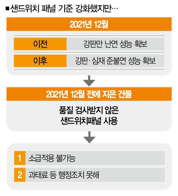 # 이를 인지한 정부는 2021년 샌드위치 패널의 안전성을 검증하는 제도를 도입했지만 어찌된 일인지 화재는 줄지 않고 있다. 왜일까. 이유는 ‘사각지대’에 놓여 있는 2021년 이전 샌드위치 패널에 있다.