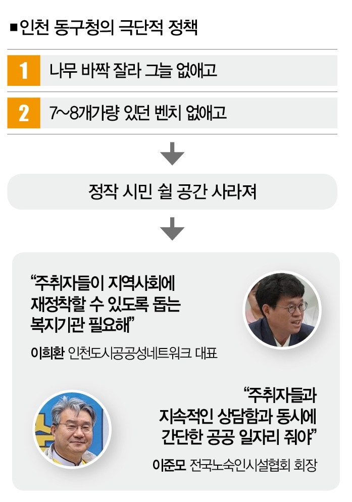 북광장을 통째로 금연ㆍ금주지역으로 묶은 동인천의 정책이 무용지물이 됐다는 건데, 더 큰 문제는 후속조치에 있다. 동구청은 노숙인과 주취자들이 아예 광장에 머물 수 없도록 ‘극단적인 정책’을 폈다. 나무를 바싹 잘라 그늘을 없애고 7~8개가량 있던 벤치도 없애버렸다. 노숙인과 주취자를 광장 밖으로 쫓아내려는 전략이었지만, 부메랑은 애먼 시민이 맞았다. 시민들이 쉴 공간이 함께 사라졌기 때문이다.