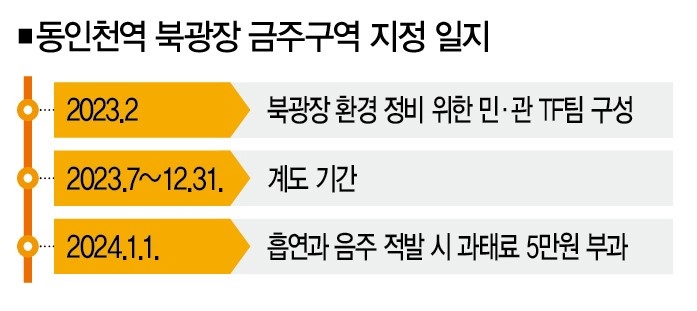 인천 동구청은 북광장 한편에 자리를 잡고 있는 노숙인과 주취자酒醉者(술에 취한 사람)의 상습 음주를 막고 환경을 정비하기 위해 이곳을 금연ㆍ금주구역으로 지정했다. 지난 1월부터는 이곳에서 담배를 피우거나 술을 마신 이들에게 과태료 5만원을 부과하고 있다.