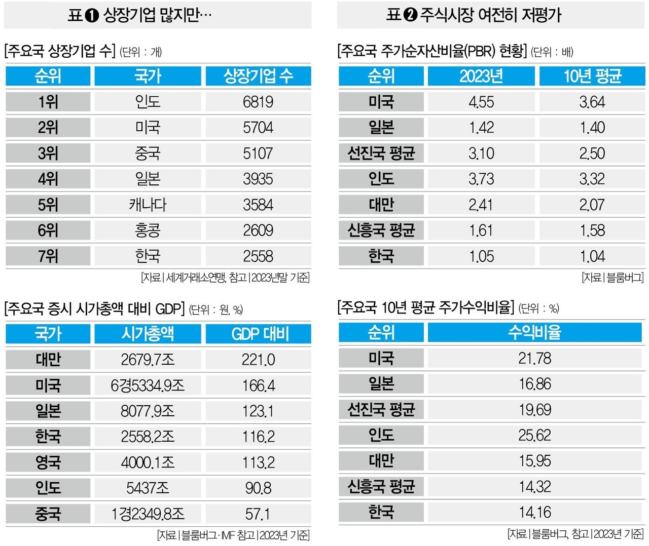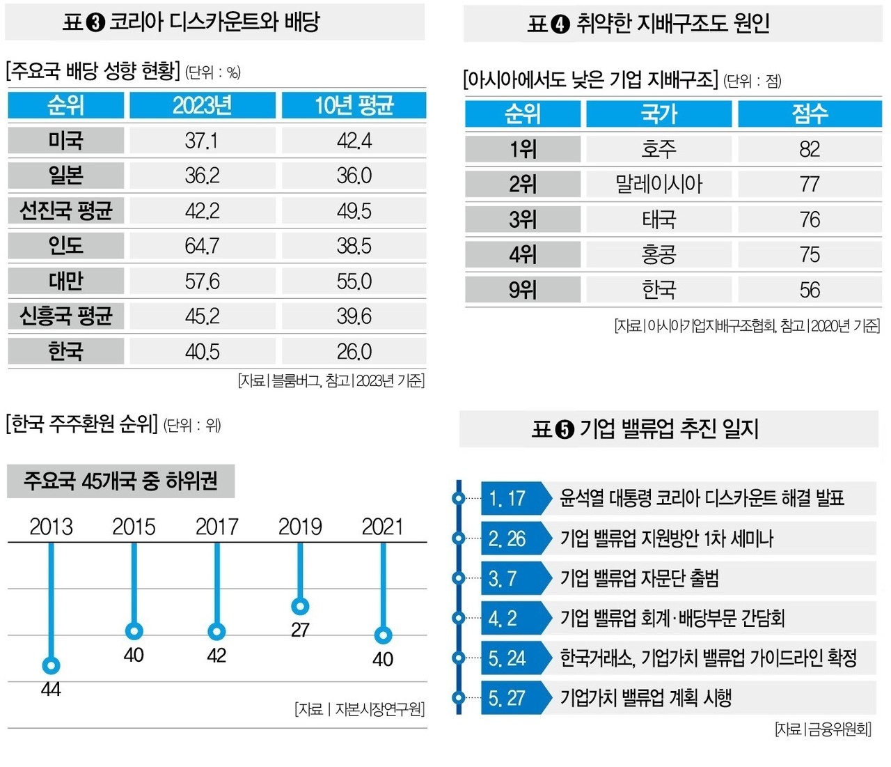 # 하지만 막상 뚜껑을 열어본 기업 밸류업의 내용은 실망스러웠다. 코리아 디스카운트 해소를 위해 꼭 필요한 낮은 배당 성향과 기업의 지배구조 개선 방안이 빠졌기 때문이었다. 소문난 잔치엔 결국 먹을 게 없었다. 視리즈 밸류업 100일의 기록 마지막 편, 한눈에 본 지표다.