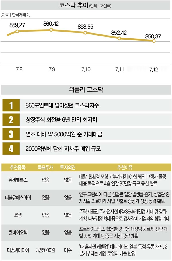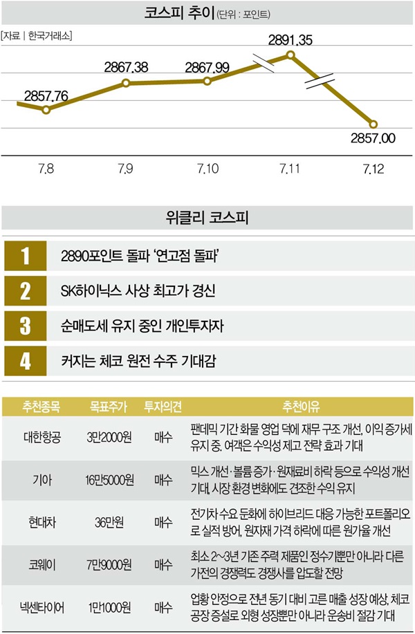 상승세를 이어가던 국내 증시에 제동이 걸렸다. 2900포인트 돌파 기대감을 키웠던 코스피지수는 지난 12일 2857.0포인트로 하락했다. 최근 860포인트대를 회복한 코스닥지수도 850.37포인트로 떨어졌다. 지난 3일부터 7거래일 연속 순매수세를 기록했던 외국인 투자자들이 매도세로 돌아선 탓이다.