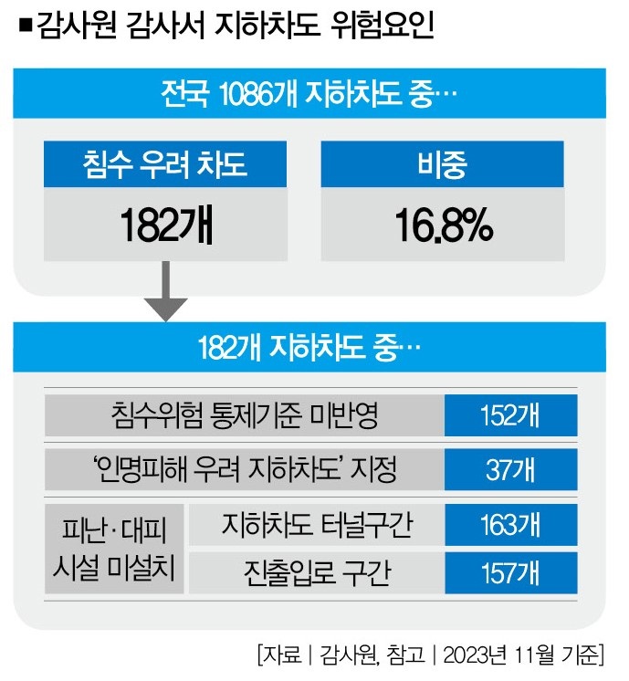 하지만 이 법 하나로 제2ㆍ제3의 오송 참사를 막는 건 역부족이다. 하천 범람 시 침수를 막을 만한 예방시스템이 너무도 부실해서다. 일례로, 전국 159개 지하차도엔 외수 침수 위험을 고려한 통제기준이 없다(감사원ㆍ2023년 11월 기준). 폭우 시 지하차도의 입구를 자동으로 차단하는 지하차도 자동차단시스템도 전국 1091개의 지하차도 가운데 252개에만 설치돼 있다. 비중으로 따지면 23.1%에 불과하다(행정안전부ㆍ2024년 4월 기준).
