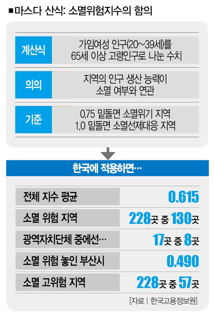 젊은 여성인구가 고령인구보다 적으면 소멸 가능성이 높을 거란 건데, 이는 출산율과 이어진 개념이다. “젊은 여성이 많은 지역일수록 출산율이 늘어난다”는 거다(마스다 산식).