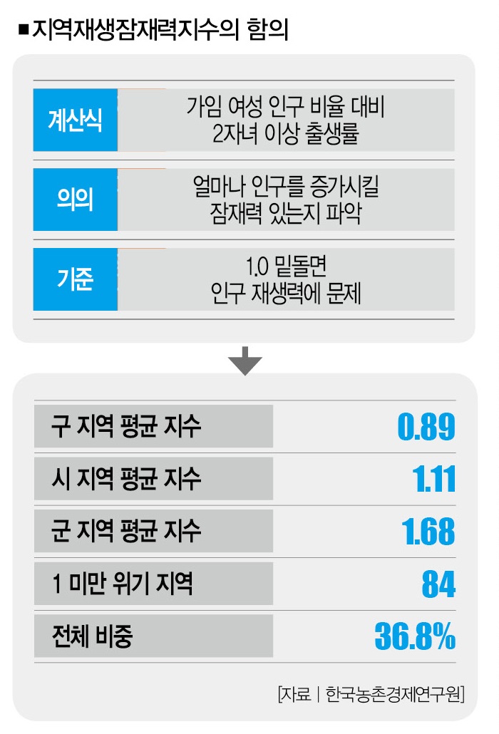 이렇게 지역재생잠재력지수가 역설적인 분석 결과를 내놓긴 했지만, 맥락 자체는 나머지 두 지표와 다를 게 없다. 지수 평균값이 1 이하로 미래 인구의 재생력 측면에서 위기를 맞은 지역은 기초지자체 228곳 중 84곳(36.8%)에 달했다. 어떤 산식으로 통계를 내더라도 우리나라의 상당수 지역이 ‘소멸 위기’에 진입한 상황이란 얘기다.