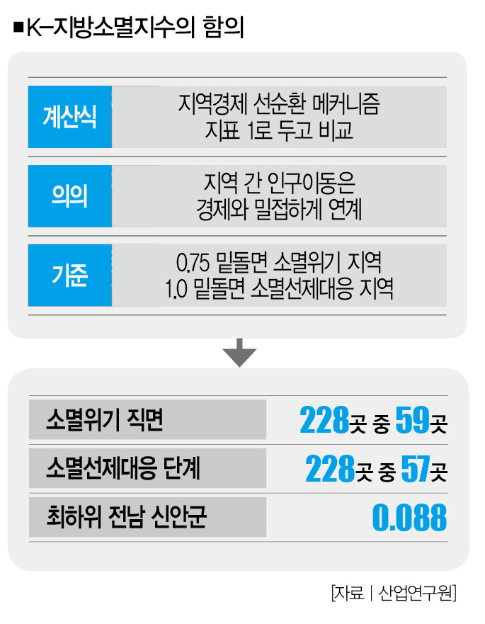 그렇다면 이 지표에선 한국의 지방소멸은 다른 양상을 보였을까. 결론부터 말하면 그렇지 않았다. K-지방소멸지수에 따르면 전국 지자체 228곳 중 소멸위기에 직면한 지역이 총 59곳이었다. 절반(130곳)을 넘어섰던 마스다 소멸지수보단 긍정적인 결과였지만, 이는 상대적인 평가일 뿐이다.