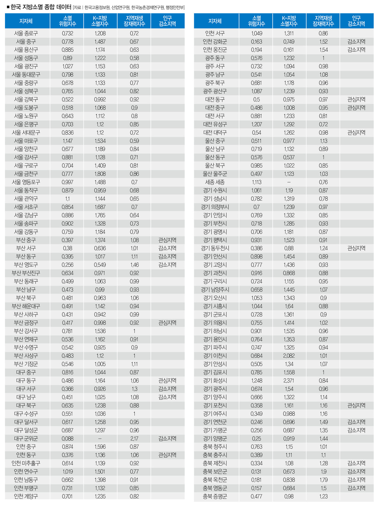 ■ 소멸의 수치화➋ 한국형 산식 = 그렇다면 마스다 산식의 한계를 보완할 한국형 지수는 없을까. 있다. 산업연구원이 개발한 ‘K-지방소멸지수’다. 단순히 인구가 어떤 비중으로 구성돼 있는지를 따지기보단 ▲1인당 연구개발비, ▲산업다양성, ▲지식산업 산업체, ▲종사자 수, ▲1인당 소득수준, ▲인구 증감률 등 6개 경제 지표를 척도로 삼았다. 이들 지표를 측정해 전국 평균을 ‘1’로 두고 비교하는 방식으로 지수를 산출했다.
