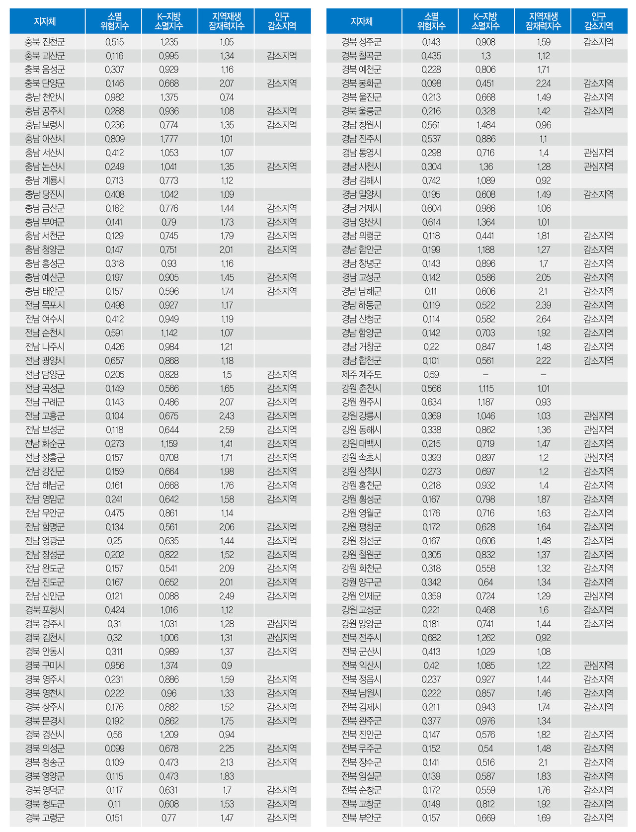 # 소멸위험지수, K-지방소멸지수. 지역재생잠재력지수, 행안부 지정 인구감소지역…. 우리나라의 소멸 정도를 파악할 수 있는 다양한 지표다. 관점이 다르고 측정 방식도 다르지만, 의의는 비슷하다. 대한민국 지방이 점점 소멸하고 있다.