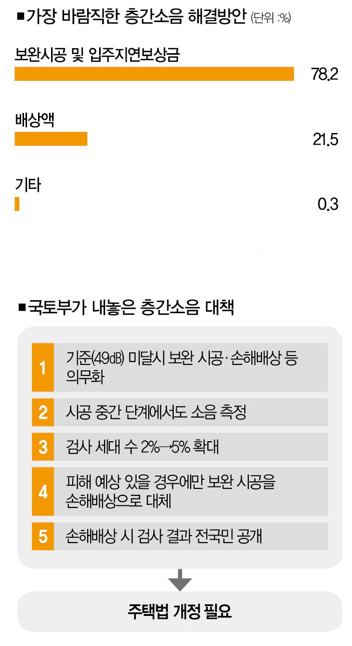 구체적인 보완책은 ▲기준 미달 시 보완시공ㆍ손해배상 등 의무화, ▲시공 중간 단계에서도 소음 측정, ▲검사 세대 수 2%→5% 확대, ▲입주 지연 등 피해 예상되는 경우에만 보완 시공을 손해배상으로 대체, ▲손해배상 시 검사 결과 전 국민 공개 등이다.
