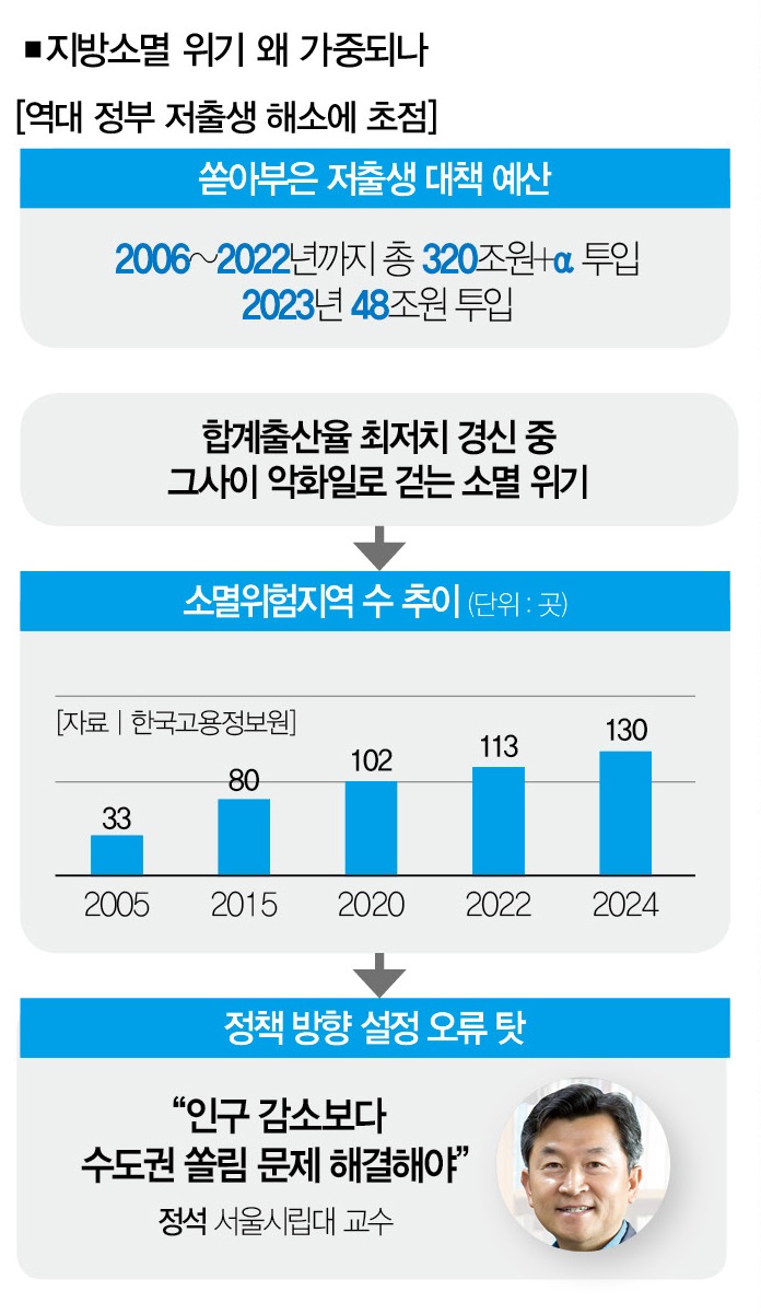 문제는 이같은 위기가 수많은 대책을 쏟아낸 끝에 나온 결과란 점이다. 수백조원에 이르는 예산을 쏟아부었지만 상황은 악화일로를 걷기만 했다. 왜일까. 답은 간단하다. 정부가 지역 소멸의 초점을 잘못 맞췄기 때문이다.