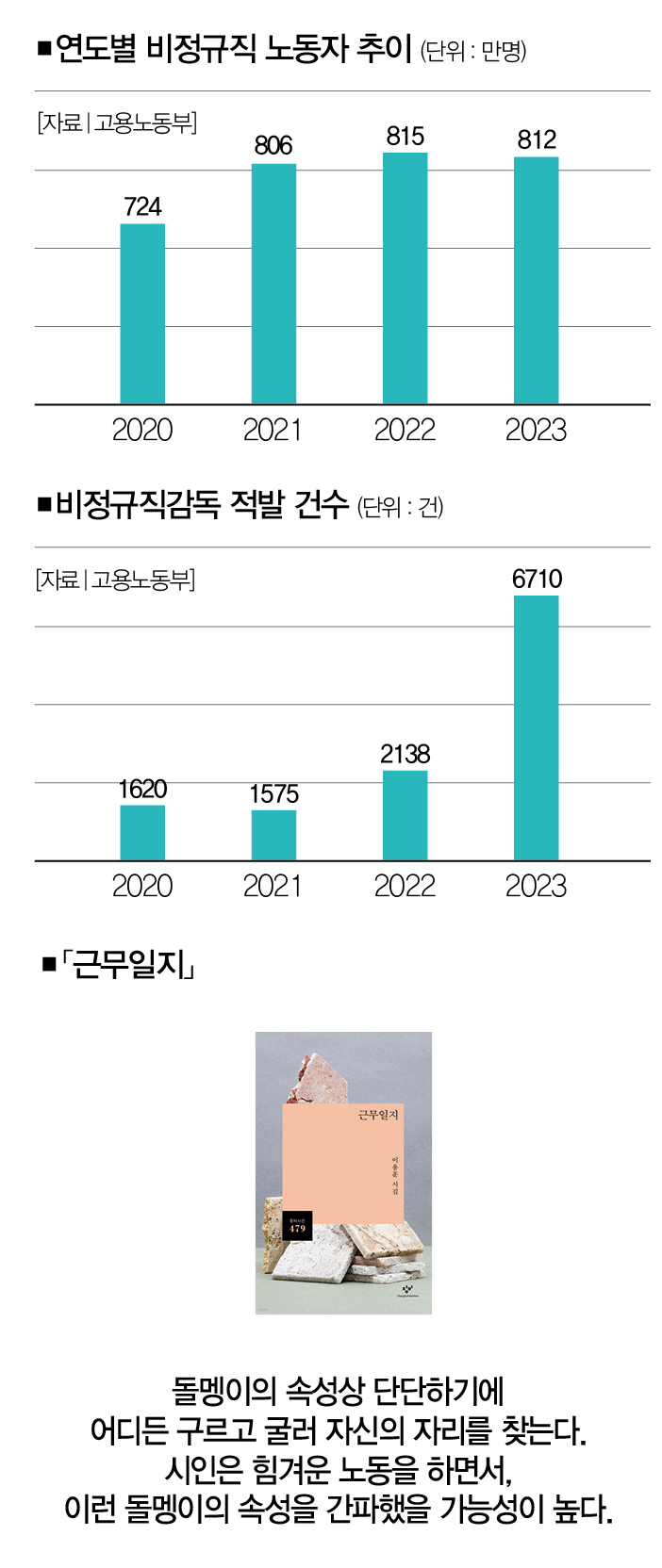 돌멩이는 어느 곳에나 가고 또 발에 차인다. 구를 수 있을 때까지 굴러 자기 자신의 자리를 찾는다. 이용훈 시인은 그런 돌멩이의 특성을 빌려 노동자의 삶을 말한다. 매번 달라지는 현장에서 버티고, 일하기 위해 새로 마련한 ‘임시 거처’에서 버티는 삶. 자기 자신의 쓸모를 증명하기 위한 누구라도 공감할 수 있는 그런 삶이다.