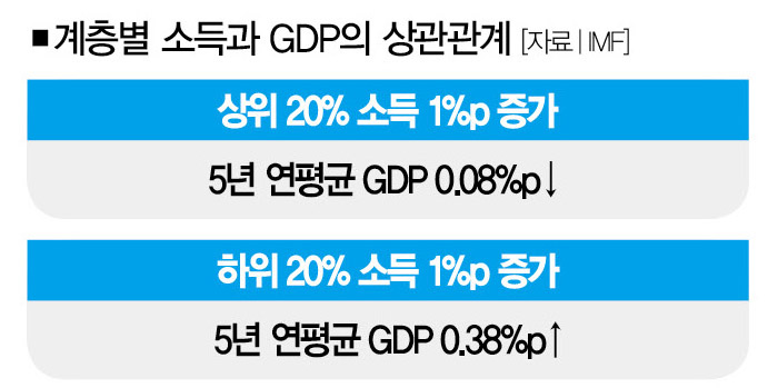 혼자서 떠드는 가설일 뿐이라고요? 그렇지 않습니다. 2015년 국제통화기금(IMF)이 150개 국가의 사례를 분석해 내놓은 결과도 다르지 않았습니다. IMF는 “상위 20%의 소득이 1%포인트 늘면 이후 5년간 국내총생산(GDP)은 연평균 0.08%포인트 감소하고, 하위 20%의 소득이 1%포인트 늘면 같은 기간 GDP가 연평균 0.38%포인트 증가한다”는 보고서를 내놓기도 했습니다. 정부가 경기를 부양하고 싶다면 고소득층이 아니라 저소득층을 지원하라는 조언을 담은 보고서였죠.