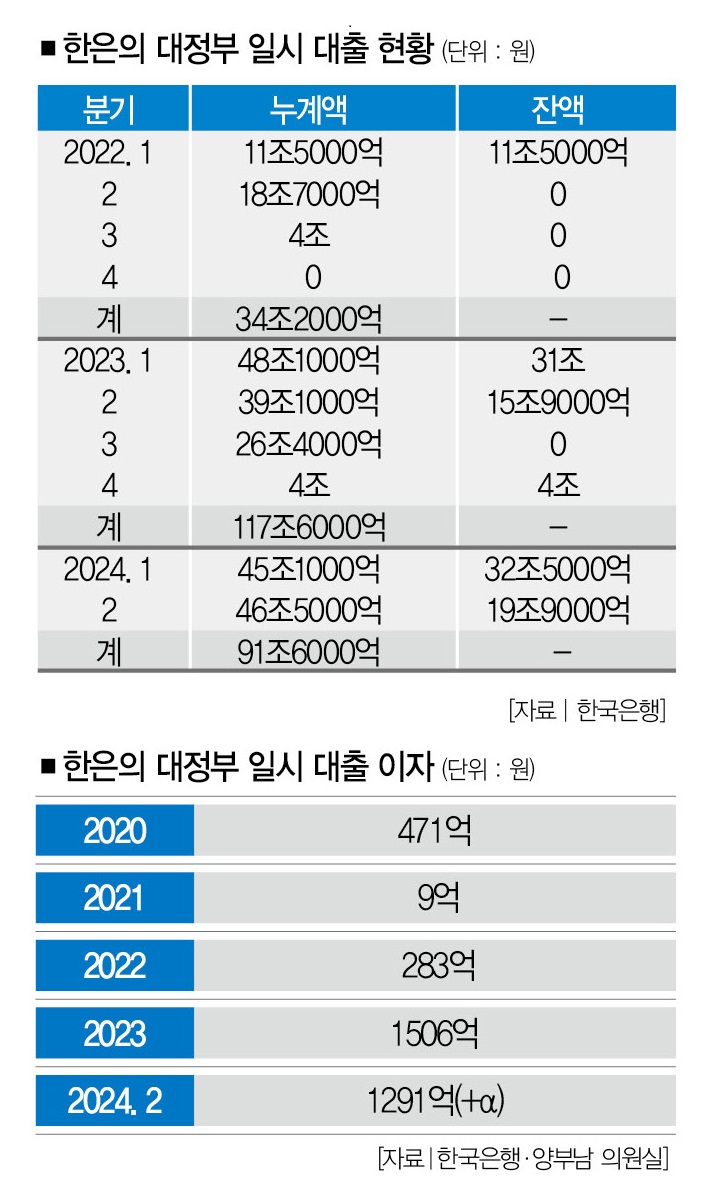 그런데 정부가 지난해 가져다 쓴 일시 대출 규모는 117조6000억원(누적 기준)에 달합니다. 코로나19 팬데믹 시기, 정부가 적극적인 대응에 나서면서 지출이 늘었던 2020년(102조9130억원)보다도 많습니다. 올해는 상반기에만 91조6000억원을 끌어다 썼습니다. 세입이 부족해서 한은으로부터 임시로 돈을 끌어다 쓰는 일이 잦았다는 방증입니다.