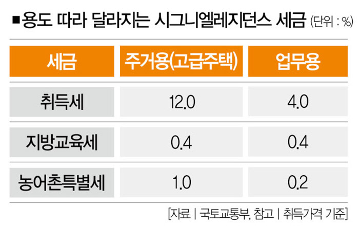 물론 세금을 약간 줄여볼 여지는 있다. 법적으로 시그니엘레지던스의 건축물 용도가 주택이 아닌 오피스텔이기 때문이다. 신고를 주거용으로 할지 업무용으로 할지 선택할 수 있는데 만약 용도를 주거용이 아닌 업무용으로 신고한다면 농어촌특별세율이 1.0%에서 0.2%로 줄어든다. 취득세율과 지방교육세율은 각각 4.0%와 0.4%로 동일하다. 주거용이 아니니 고급주택 세율도 적용되지 않는다. 이때 세금은 11억400만원이다.