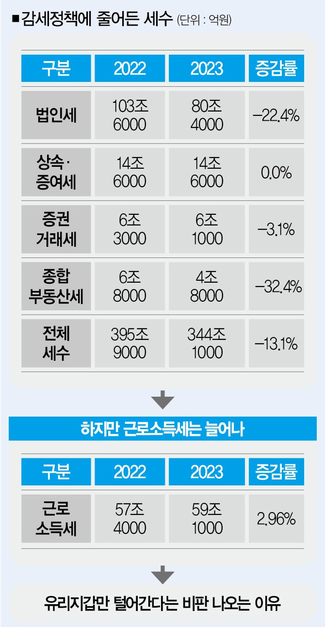 정부가 400조5000억원의 세입예산안을 만들었지만 실제로 거둬들인 세금은 344조1000억원에 불과했습니다. 앞서 언급했듯 정부가 추진한 감세정책으로 법인세, 종부세, 상속·증여세 등이 감소했기 때문이죠.