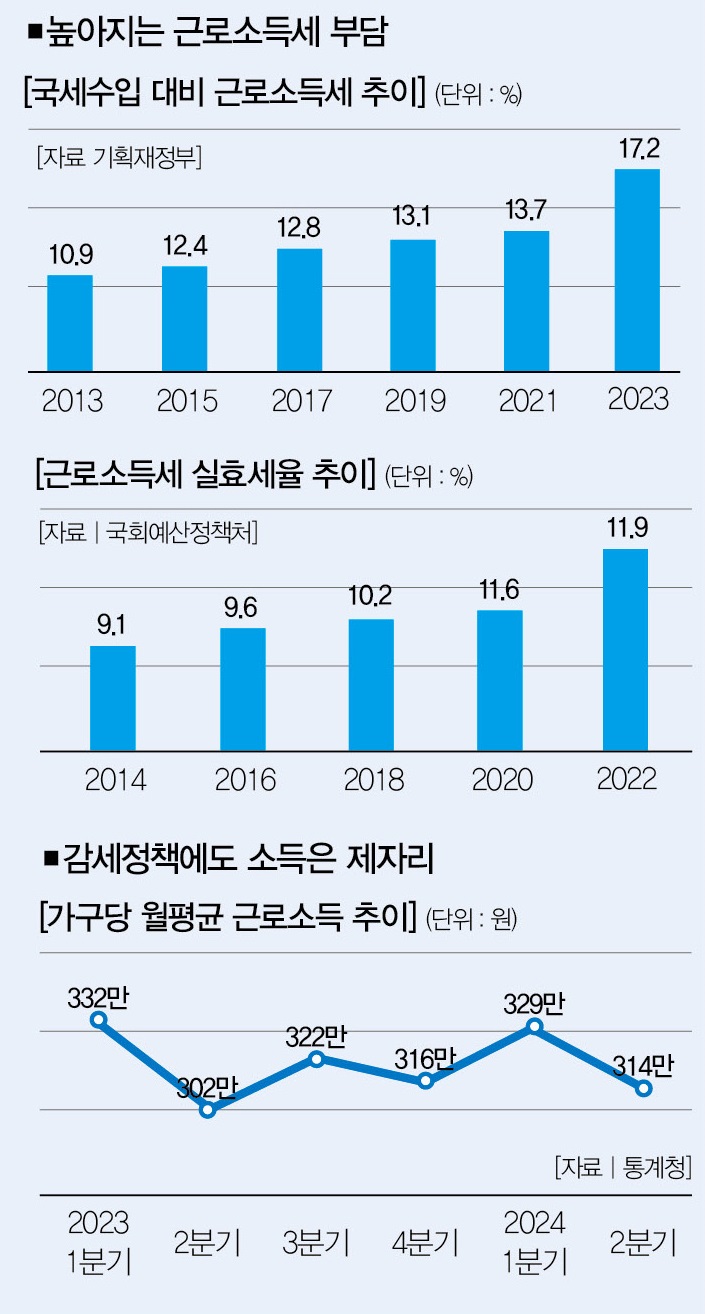 근로소득세가 늘면서 국세에서 차지하는 비중도 사상 최고치를 경신했습니다. 지난해 근로소득세의 비중은 17.2%를 기록했습니다. 10년 사이 6.3%포인트 올라간 수치입니다. 국세에서 직장인이 내는 근로소득세의 비중이 그만큼 커졌다는 의미죠. 정부가 부자들의 세금만 깎아주고 월급쟁이는 배려하지 않는다는 푸념이 제기되는 이유입니다.