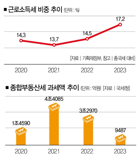 결국 만만한 건 월급쟁이였다. 지난해 근로소득세가 총국세에서 차지하는 비중은 사상 최고인 17.2%를 기록했다. 총국세가 2022년 395조9000억원에서 2023년 344조1000억원으로 확 꺾였는데도, 근로소득세 수입이 2022년 57조4000억원에서 2023년 59조1000억원으로 오히려 증가한 결과다.