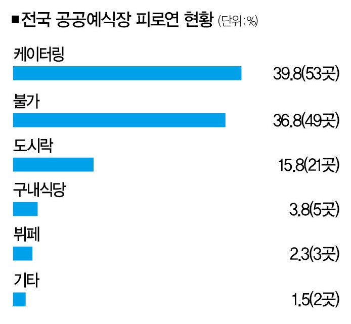 물론 케이터링(출장 뷔페)이 가능한 공공예식장이 있지만(53곳) 편한 방법은 아니다. 케이터링 업체를 결정하고, 음식을 고르고, 추가 비용을 치르는 것까지 온전히 예비부부의 몫이어서다. 더 큰 문제는 피로연이 불가능한 예식장이 49곳이나 된다는 점이다. 이는 전체 공공예식장의 36.8%에 달하는 수치다.
