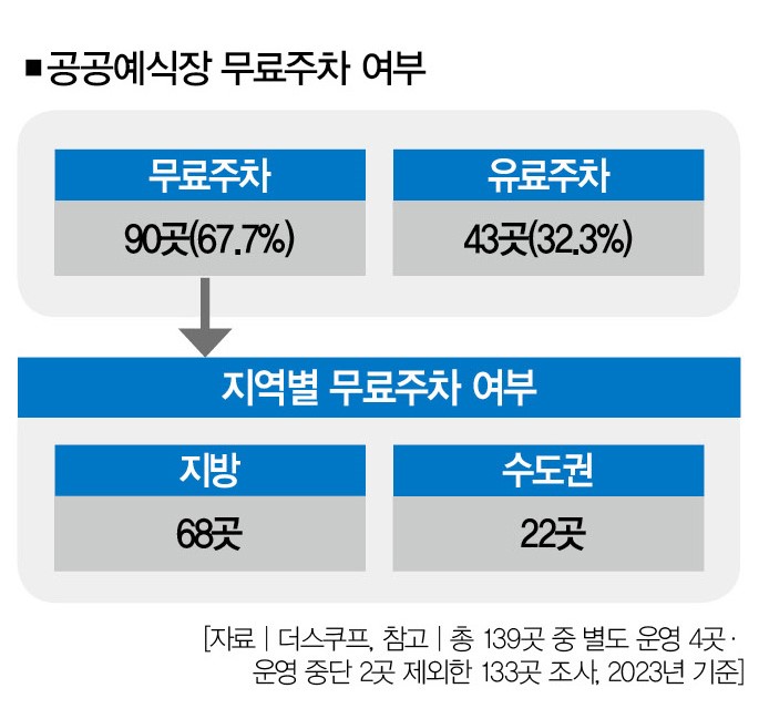‘주차’도 공공예식장이 해결해야 할 과제 중 하나다. 공공예식장 133곳 중 무료주차가 가능한 곳은 90곳으로 비중은 67.7%였다. 역으로 보면, 43곳(32.3%)은 무료주차를 할 수 없다는 거다.