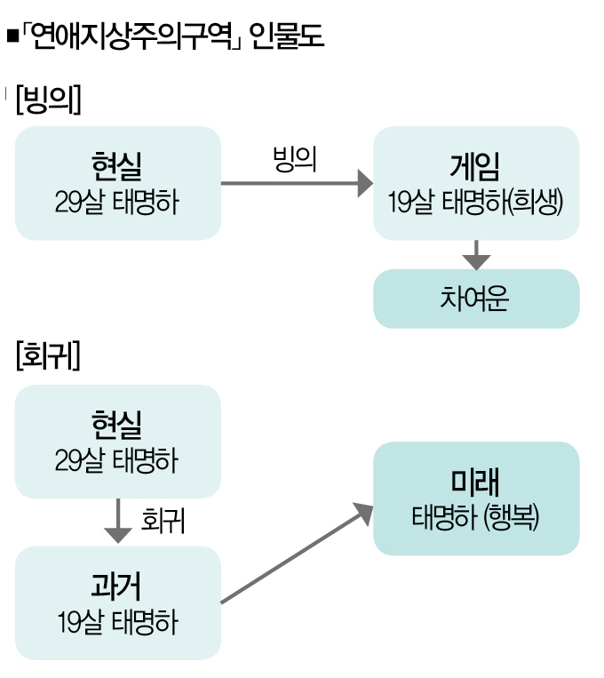 웹소설 하면 흔하게 떠오르는 3가지 코드가 있다. 회귀, 빙의, 환생, 줄여서 회빙환이다. 이제는 웹소설에서 거의 공식으로 읽힐 만큼 유행이 된 소재들이다. 이 소재를 접했을 때 독자들은 주인공의 빠른 성장과 성취를 기대한다. 「연애지상주의구역」은 다르다. 회귀와 빙의라는 일종의 치트키가 ‘빠른 전개’와는 거리가 있다.