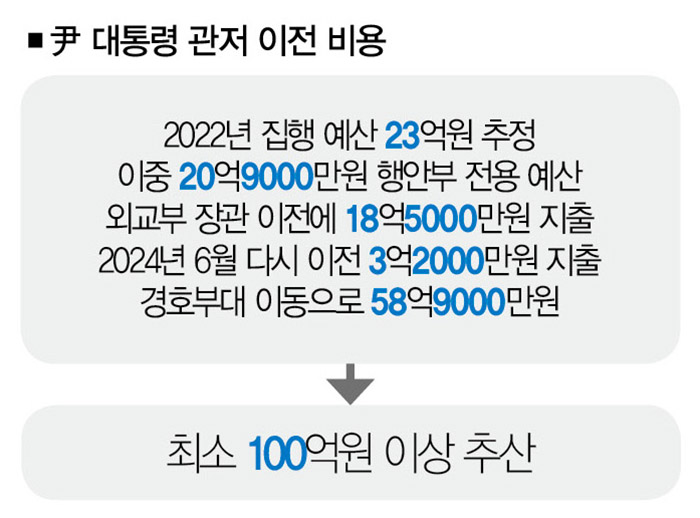 여기가 끝이 아니었다. 2대 외교부 수장에 오른 조태열 장관이 2024년 6월 궁정동의 옛 경호처장 관저로 주거동을 옮기면서 3억2000만원을 추가로 썼다. 결과적으로 대통령실 관저 이사와 파생 비용에 적어도 45억원을 사용했다. 수도방위사령부 소속 경호부대가 관저와 집무실 이전에 따라 함께 이동하면서 58억9000만원을 지출했다는 점을 감안하면, 윤 대통령 부부를 위해 어마어마한 혈세를 투입한 셈이다.