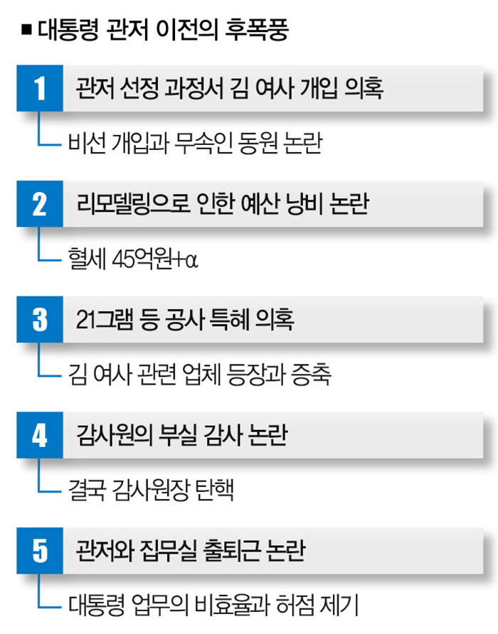■ 논란➌ 공사 특혜 의혹 = 논란의 도마에 오른 건 비용만이 아니었다. 관저의 리모델링 공사 자체도 숱한 의혹을 남겼다. 김 여사가 대표로 있던 전시기획업체 코바나컨텐츠의 전시 후원사였던 실내건축업체 ‘21그램’이 수의계약으로 관저 개보수 공사를 따냈기 때문이다.