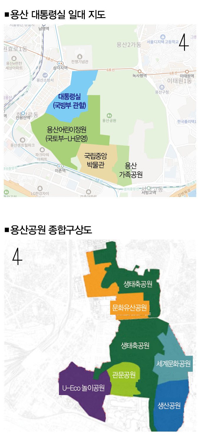 이 때문에 용산 종합기본계획의 원안도 다소 흐트러졌다. 애초 공원 출입구는 총 6개였다. 그중 이촌역 남쪽 출입구 옆엔 자전거 등을 타고 공원을 드나드는 통로를 만들 계획이었다. 하지만 이 통로는 지금 대통령실로 향하는 ‘차량용 출입구’로 쓰인다. 애초 계획대로였다면 시민들이 이용했을 길이다.