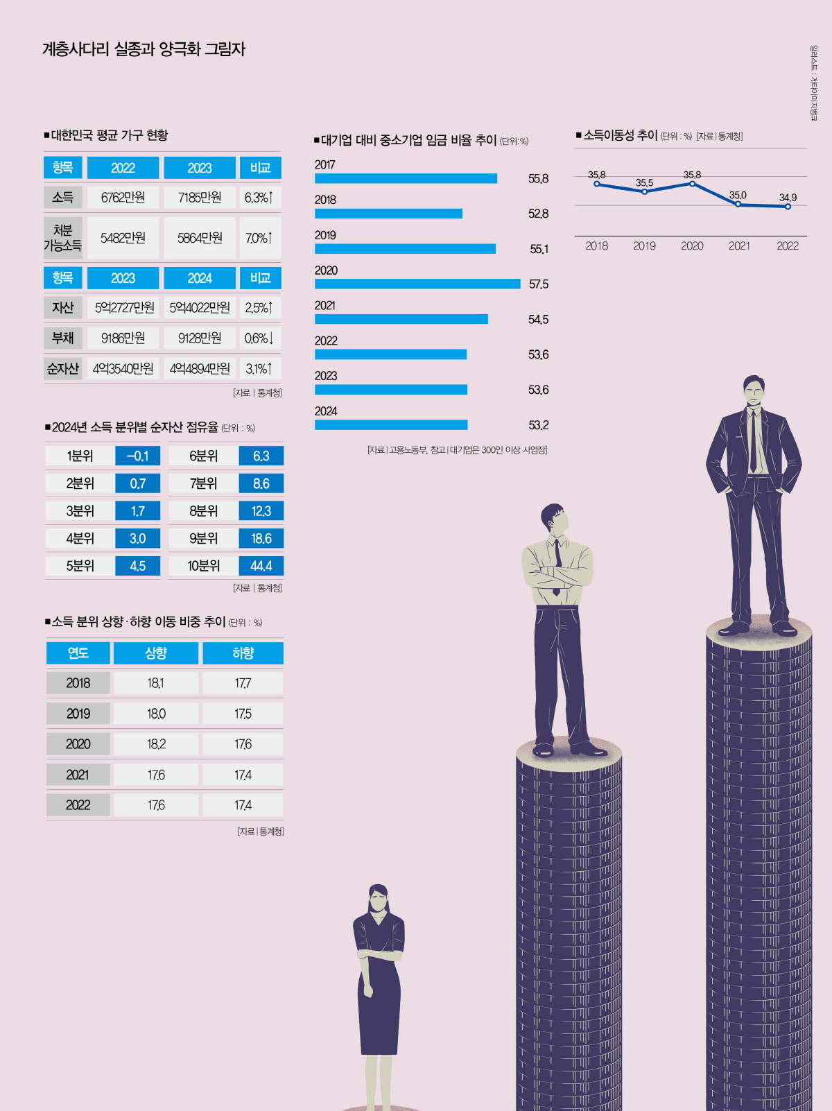 더 큰 문제는 소득과 자산 격차가 벌어질수록 계층 간 이동은 더 어려워진다는 점이다. 양극화가 경제적·사회적 성공을 위한 ‘기회의 평등’마저 위협하고 있다는 거다. 통계청이 지난 12월 처음으로 발표한 ‘소득이동통계(2017~2022년 조사)’는 계층사다리가 사라지는 한국의 민낯을 보여줬다. 소득이동통계는 기회의 평등을 측정한 지표다. ‘소득이동성’이 낮아질수록 기존의 소득 분위가 고착화하고, 시간이 흐를수록 소득 격차를 해소하기 어려워진다.