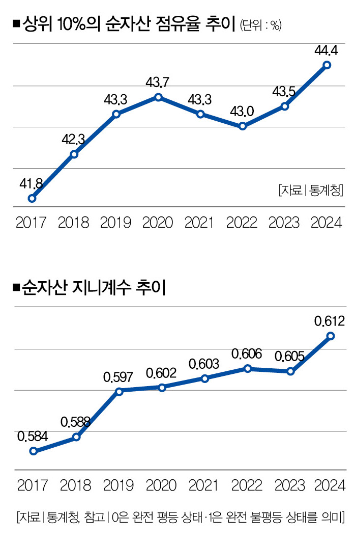 자산 불평등 정도를 나타내는 ‘순자산 지니계수’도 악화했다. 2017년 0.584를 기록한 순자산 지니계수는 2018년 0.588, 2019년 0.597, 2020년 0.602, 2021년 0.603, 2022년 0.606, 2023년 0.605, 2024년 0.612로 거의 매년(2023년 제외) 높아졌다. 순자산 지니계수가 1에 가까워질수록 불평등이 심해진다는 걸 의미한다.