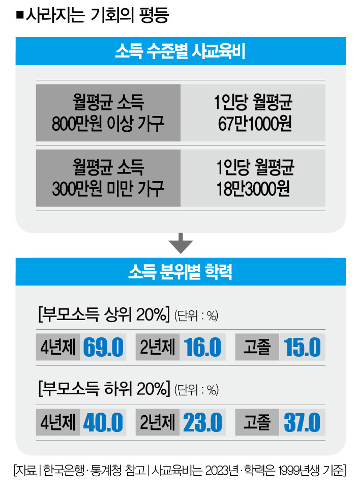 사교육 의존도가 높아지면서 부모의 경제력이 자녀의 학력 격차로 그대로 이어졌다. 부모 소득이 상위 20%(5분위)인 가구의 자녀(이하 1999년생 기준)의 경우 4년제 이상 진학률은 69.0%, 2년제 16.0%, 고졸 15.0%로 나타났다. 반면 부모 소득이 하위 20%(1분위)인 가구 자녀의 경우 4년제 이상 40. 0%, 2년제 23.0%, 고졸 37.0%였다. 경제적 ‘결과의 불평등’이 ‘기회의 불평등’으로 이어진 셈이다.