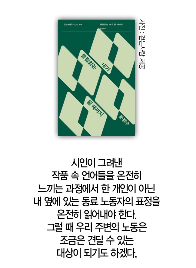 우리는 하루 웃고 하루 운다는 점에서 시집 속에 담긴 표정은 그때의 순간이다. 그러니 시집에 다급하게 동정을 보내는 건 조심할 필요가 있다. 그보다는 시인이 그려낸 작품 속 언어들을 온전히 느끼는 과정에서 한 개인이 아닌 내 옆에 있는 동료 노동자의 표정을 온전히 읽어내야 한다. 그럴 때 우리 주변의 노동은 조금은 견딜 수 있는 대상이 되기도 하겠다.
