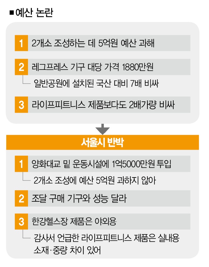 그는 또 “공공 조달 구매로 설치한 양화대교 밑 운동시설에는 1억5000만원을 투입했다”면서 “강서ㆍ광나루 한강헬스장 2개소를 조성하는 데 5억여원이 들었으니 과하거나 무리한 예산을 집행한 건 아니다”고 주장했다.