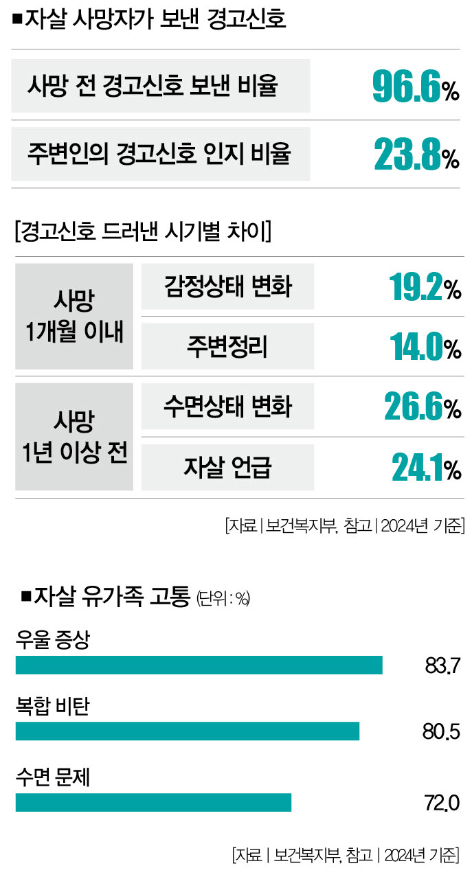 자살은 개인 문제에서 그치지 않는다. 한 사람의 자살로 평균 6명의 유족이 발생하고 이들의 자살 위험은 일반인의 20배(삼성서울병원·2022년 기준)에 달한다. 보건복지부에 따르면 자살 유가족의 경우 83.7%(2024년 기준)가 우울 증상을 겪고, 그중 심각한 우울을 경험하는 이들은 20.0%나 된다. 복합적인 비탄에 빠지거나(80.5%), 수면 문제(72.0%)를 겪는 경우도 많다.