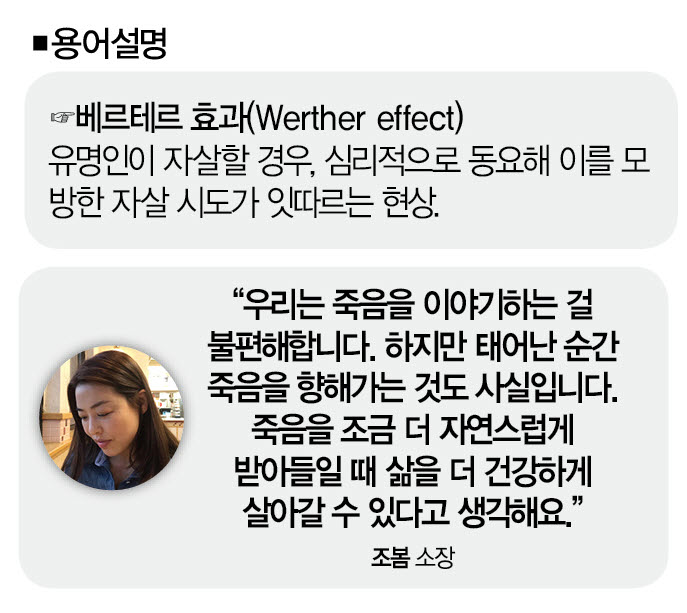 ✚ 그렇다면 ‘자살 문제’를 더 이상 숨기지 말고 공론화하는 건 어떨까요? ‘베르테르 효과(용어설명 참조)’가 걱정되긴 하지만, 자살의 문제를 ‘열린 공간’에서 논의하고 해법을 찾아보자는 거죠. 그런데 정부는 ‘베르테르 효과’를 우려해서인지 ‘자살 사건의 보도를 자제하자’는 입장을 고수하고 있어요.