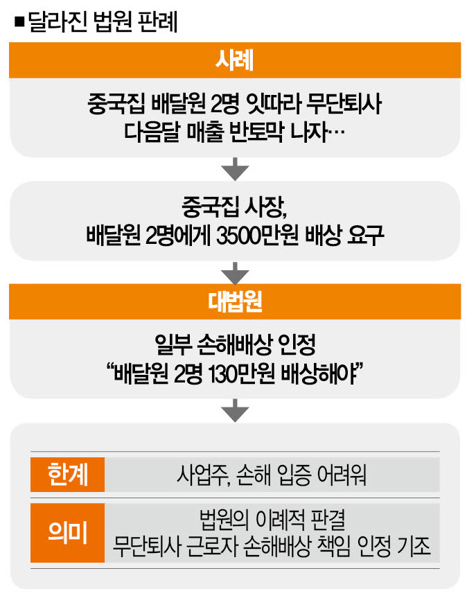 # 2022년 중국집 배달원 2명이 3일 간격으로 무단퇴사를 했습니다. 당연히 배달이 중단됐고, 다음달 매출액이 반토막이 났죠. 중국집 사장은 무단퇴사한 배달원 2명에게 매출 감소액(3500만원)의 배상을 요구하며 소송을 제기했습니다. 대법원은 일부 손해배상을 인정했습니다.