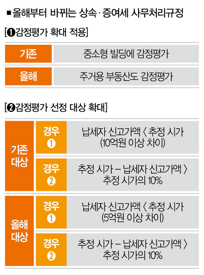 이런 점을 감안해 국세청은 올해부터 주거용 부동산에도 상속ㆍ증여세 과세를 위한 감정평가를 확대 적용하기로 했는데, 그 방향성이 나타난 게 ‘상속세 및 증여세 사무처리규정’의 개정 내용이다. 이를 통해 감정평가 선정 대상을 정하는 기준을 바꿨다는 점도 주목해야 한다.