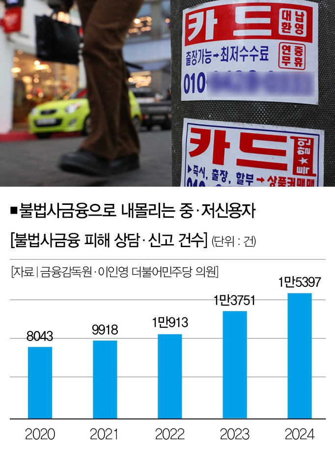 실제로 지난해 불법사금융 피해신고센터에 접수된 피해 상담·신고 건수는 역대 최대치인 1만5397건을 기록했다(이인영 의원실). 2020년 8043건에서 2배 가깝게 늘어난 수치다. 제도권 금융기관에서 대출 받는 게 어려워진 중·저신용자들이 불법사금융의 시장으로 유입됐다는 방증이다.